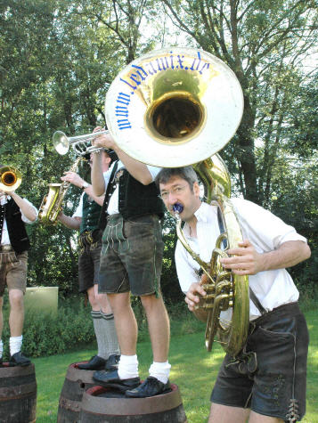 Da Bernie ist für das organisatorische Gelingen der Ledawix zuständig. Er (ver)plant unsere spärlich gesäten freien Stunden mit sämtlichen Terminen. „Je mehr g’spuid wird desto besser“ – so sein Motto! Er bläst das größte Instrument von uns allen und gibt auch sonst gern mal den Ton an. Seine musikalische Laufbahn hat da Bernie eigentlich mit der Trompete begonnen, aber letztendlich ist er dann doch bei der Tuba gelandet. Bei am Stamperl Schnaps - für das er immer gern zu haben ist – erzählt er euch sicher wie’s dazu kam. Nebst der Tuba hängt er sich oft sein „Schliafduachi“* rum, um für den richtigen Sound zu sorgen. Er ist immer drauf bedacht, dass wir gut nach Hause kommen und wenn wir es doch mal nicht mehr soweit schaffen, dann haben wir bei Ihm immer ein Dach über dem Kopf.
