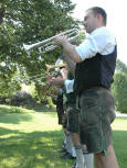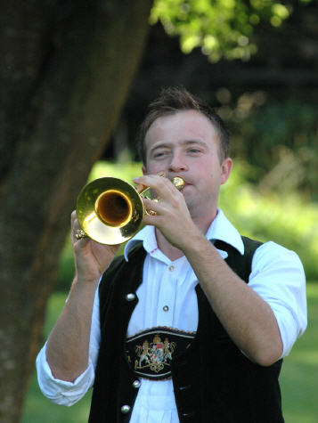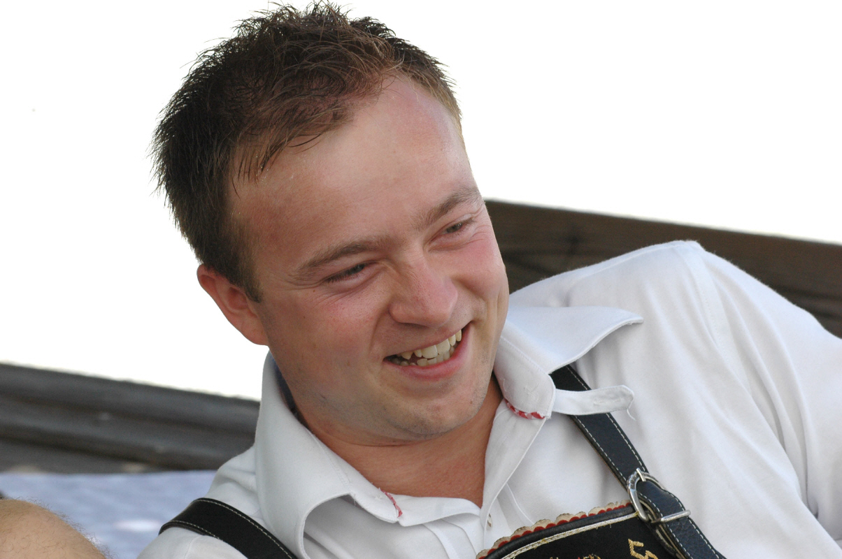 Das Nesthäkchen der Ledawix. Am besten beschreibt ihn folgendes Zitat: „Er muss wohl der einigste Trompeter der Welt sein“. Das kommt daher, dass er am liebsten auf fünf Hochzeiten gleichzeitig spielen würde. Er ist eben ein Vollblutmusikant mit Liebe zu seinem Instrument. Der Größte ist er nicht, daher steigt er gern auf Bänke und Tische um somit seine Trompetenklänge bis in die letzten Ecken eines jeden Festzeltes zu blasen. Seine Lungenkapazität reicht zwar für lange Töne aus, doch kann´s ab und zu schon mal vorkommen, dass er über seinen Ansatz jammert. Da Stefan hat keine Laster; weder trinkt er maßlos, noch raucht er und wild durch die Gegend flirten tut er auch nicht. Jedoch fallen bei seinem charmanten Lächeln die Schwiegermütter reihenweise von den Bänken. Nebst dem Trompetenspielen is da Stefan auch noch für die Finanzen der Ledawix zuständig.
